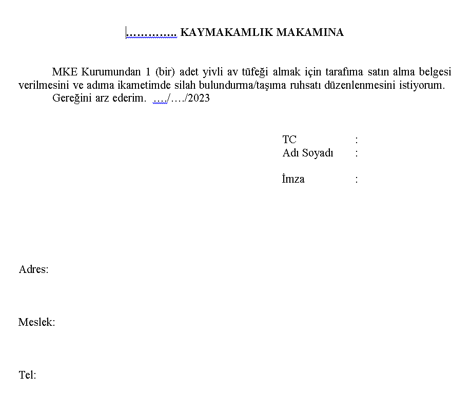 MKE den yivli av tüfeği ruhsatı için dilekçe örneği aşağıdadır.